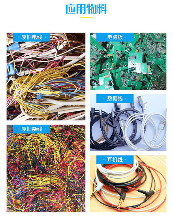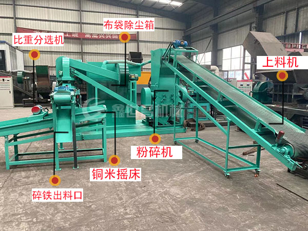 1、将原料(除铁)放入粉碎机,粉碎机将原料切成大约5 cm左右的散状物料;2、经带式输送机(可加装除铁器)输送至破碎机。3、破碎(根据原料的线径装配相应的筛网)将散状物料切削成0.3-5 mm的颗粒状物料,然后通过直线筛再次分离从而得到更加干净的紫铜。4、分离出的塑料(塑料和少量的细铜丝)可通过直线筛再次分离得到更干净的紫铜。5、通过直线筛再分离出的塑料(塑料和少量的细铜丝),从而达到更高的回收率。